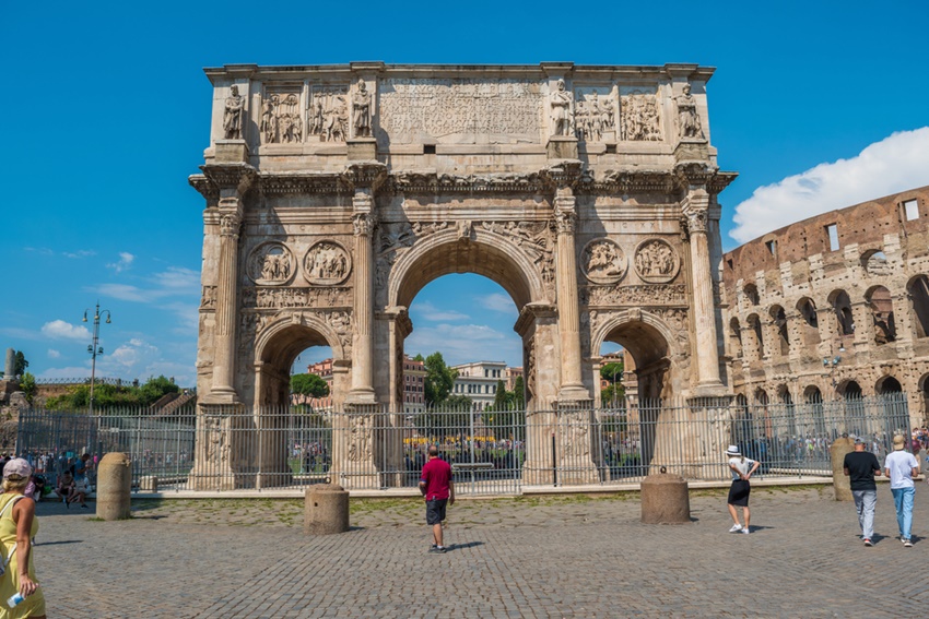O arco triunfal, que remonta ao século 4 d.C., foi erguido em celebração à vitória de Constantino, o primeiro imperador romano convertido ao Cristianismo, sobre seu rival, Magêncio. Com 25 metros de altura, ele é uma construção imponente localizada em uma área de pedestres perto do Coliseu, um dos pontos turísticos mais visitados da cidade.